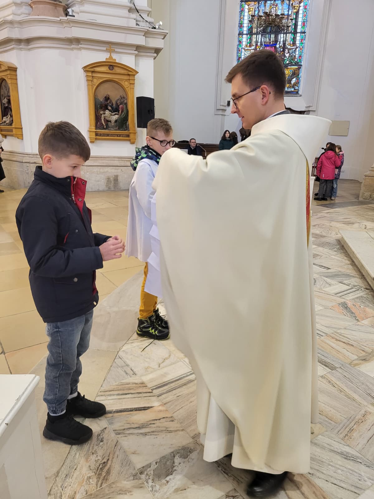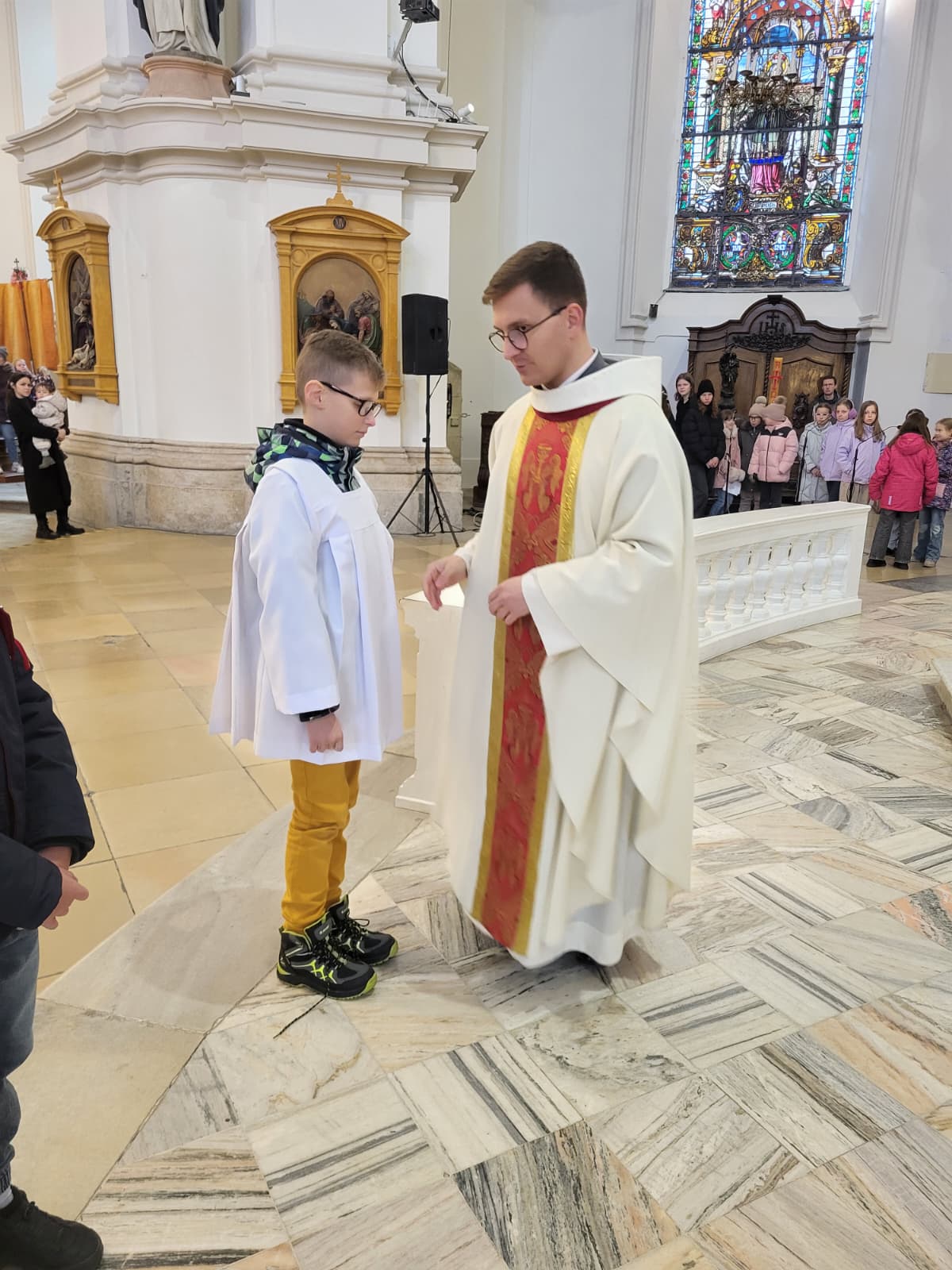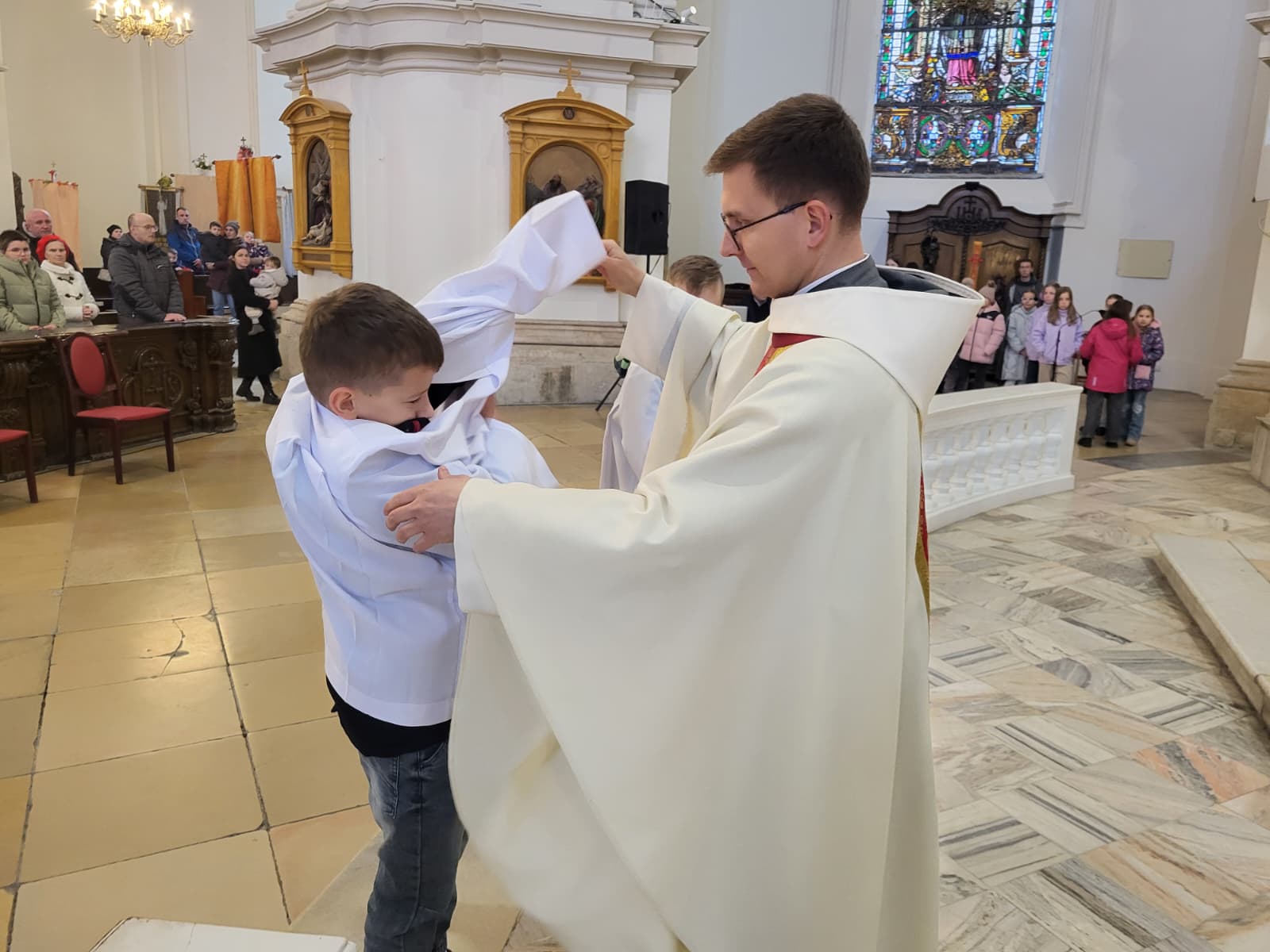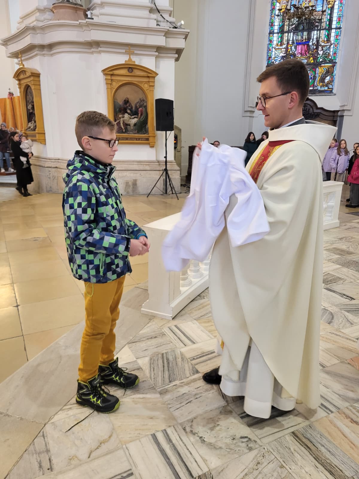 W naszej parafii podczas Mszy Świętej o 11:30 dwóch chłopców zostało przyjętych do grona kandydatów na ministrantów. Przez najbliższy rok będą się przygotowywali, obserwowali i uczyli na czym polega służba ministrantów przy ołtarzu i nie tylko. Nowym kandydatom życzymy wytrwałości i przy okazji zachęcamy innych, aby nie bali się zaangażować w tę piękną służbę.